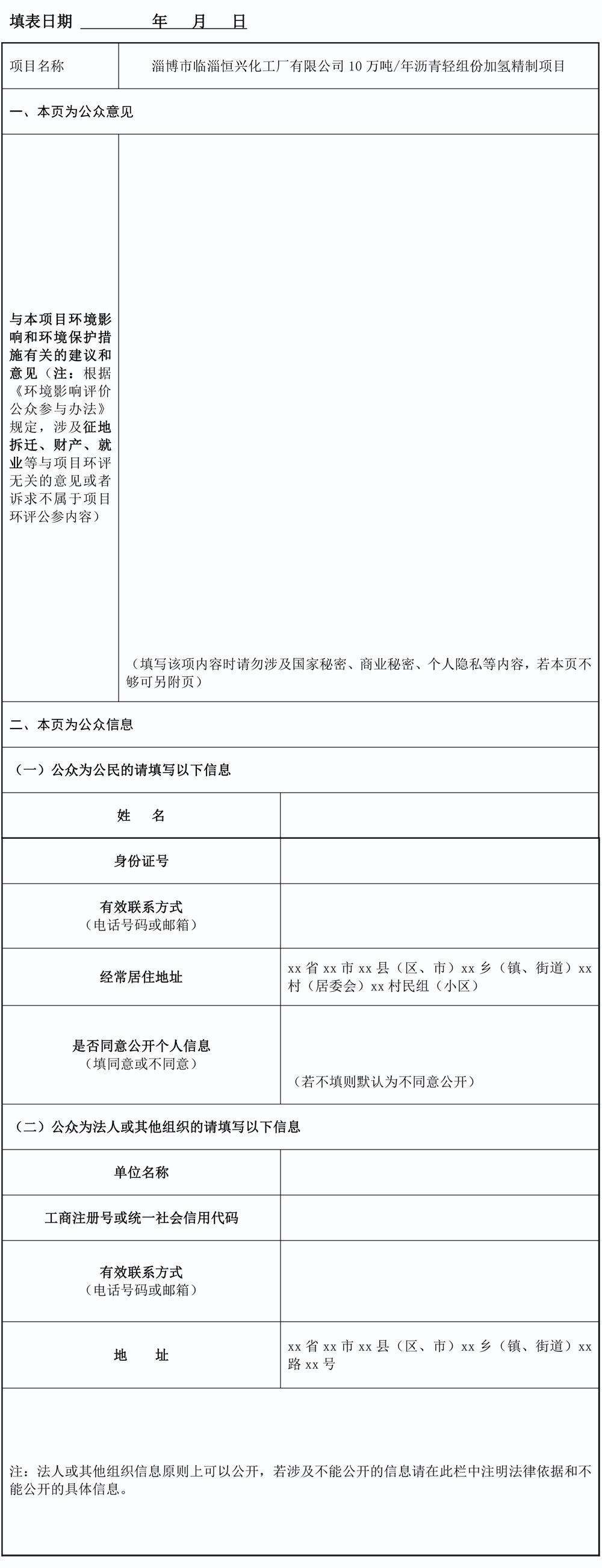 项目名称:淄博市临淄恒兴化工厂有限公司10万吨/年沥青轻组份加氢精制项目