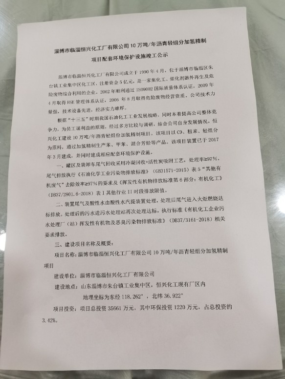 淄博市临淄恒兴化工厂有限公司10万吨/年沥青轻组分加氢精制 项目配套环境保护设施竣工公示