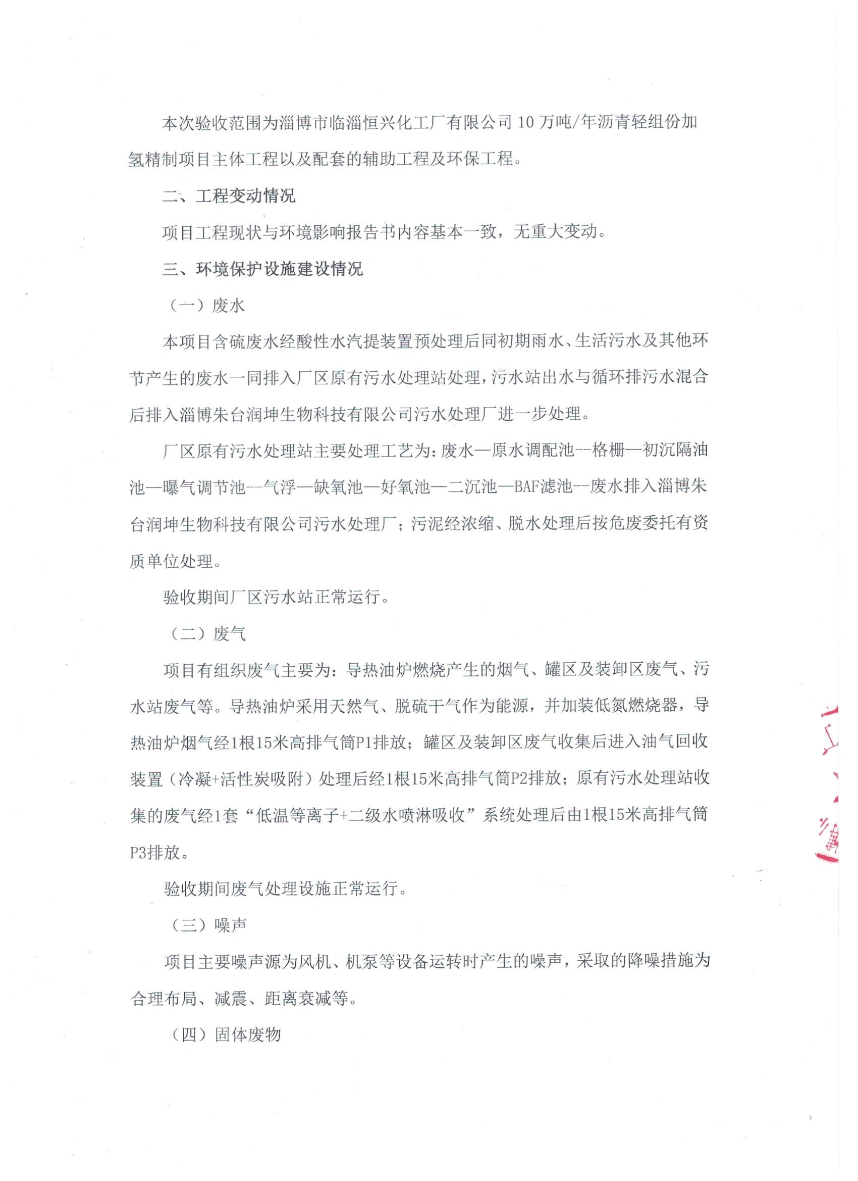 淄博市临淄恒兴化工厂有限公司10万吨/年沥青轻组分加氢精制项目竣工环境保护验收公示